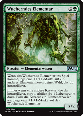 | Rules | When Overgrowth Elemental enters the battlefield, put a +1/+1 counter on another target Elemental you control. Whenever another creature you control dies, you gain 1 life. If that creature was an Elemental, put a +1/+1 counter on Overgrowth Elemental. |