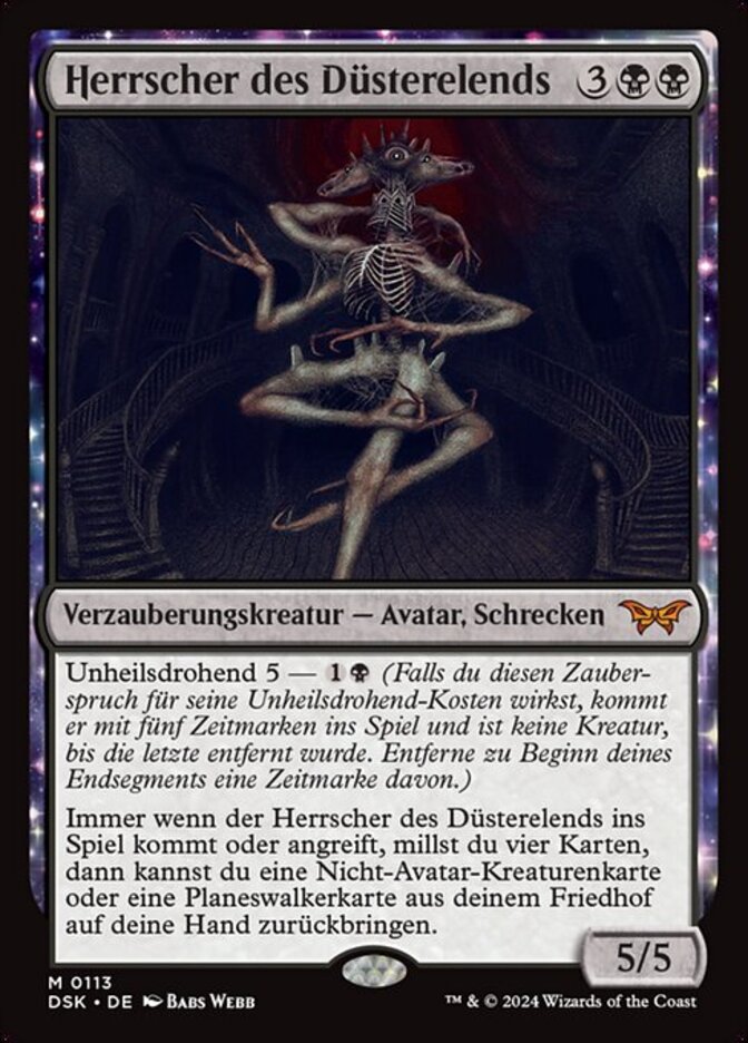 | Rules | Impending 5— (If you cast this spell for its impending cost, it enters with five time counters and isn't a creature until the last is removed. At the beginning of your end step, remove a time counter from it.) Whenever Overlord of the Balemurk enters or attacks, mill four cards, then you may return a non-Avatar creature card or a planeswalker card from your graveyard to your hand. |