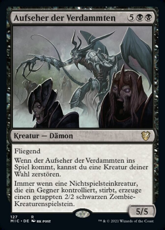 | Rules | Flying When Overseer of the Damned enters the battlefield, you may destroy target creature. Whenever a nontoken creature an opponent controls dies, create a tapped 2/2 black Zombie creature token. |