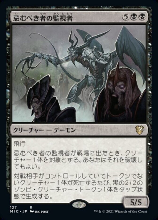 | Rules | Flying When Overseer of the Damned enters the battlefield, you may destroy target creature. Whenever a nontoken creature an opponent controls dies, create a tapped 2/2 black Zombie creature token. |