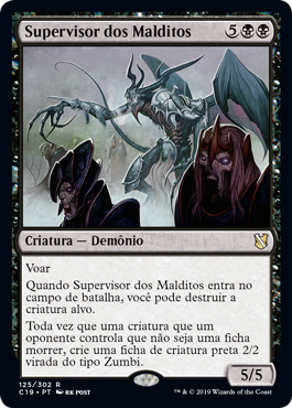 | Rules | Flying When Overseer of the Damned enters the battlefield, you may destroy target creature. Whenever a nontoken creature an opponent controls dies, create a tapped 2/2 black Zombie creature token. |