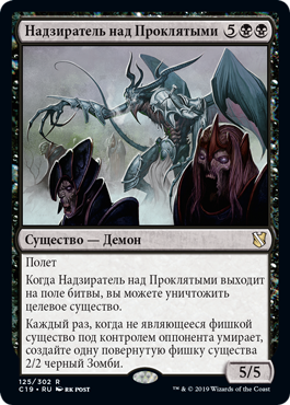 | Rules | Flying When Overseer of the Damned enters the battlefield, you may destroy target creature. Whenever a nontoken creature an opponent controls dies, create a tapped 2/2 black Zombie creature token. |