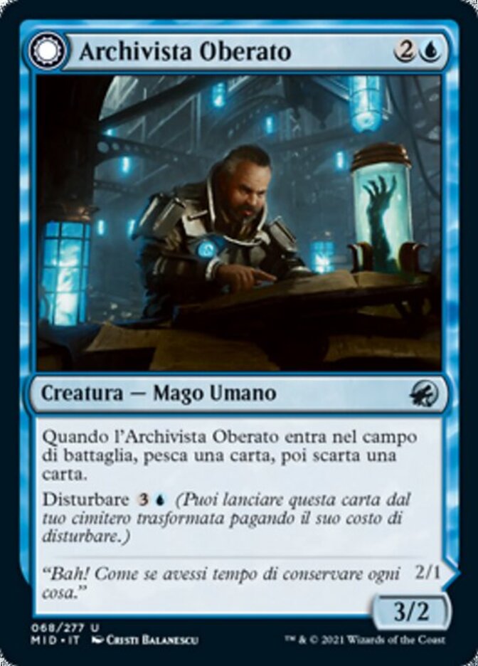 | Rules | When Overwhelmed Archivist enters the battlefield, draw a card, then discard a card. Disturb (You may cast this card from your graveyard transformed for its disturb cost.) // Flying Whenever Archive Haunt attacks, draw a card, then discard a card. If Archive Haunt would be put into a graveyard from anywhere, exile it instead. |