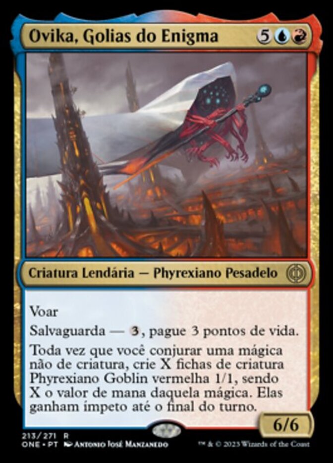 | Rules | Flying Ward—, Pay 3 life. Whenever you cast a noncreature spell, create X 1/1 red Phyrexian Goblin creature tokens, where X is the mana value of that spell. They gain haste until end of turn. |