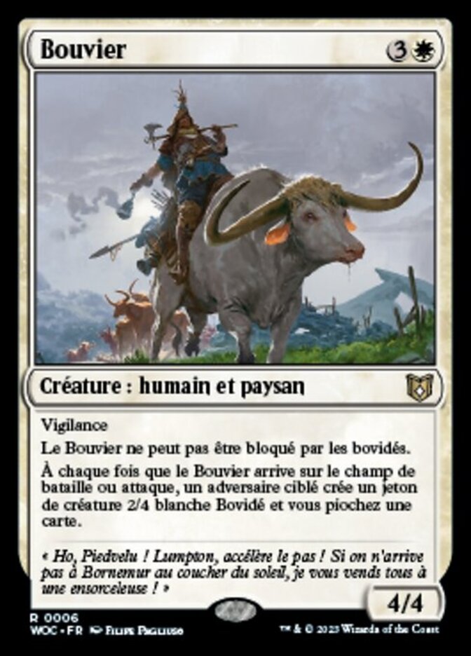 | Rules | Vigilance Ox Drover can't be blocked by Oxen. Whenever Ox Drover enters the battlefield or attacks, target opponent creates a 2/4 white Ox creature token and you draw a card. |