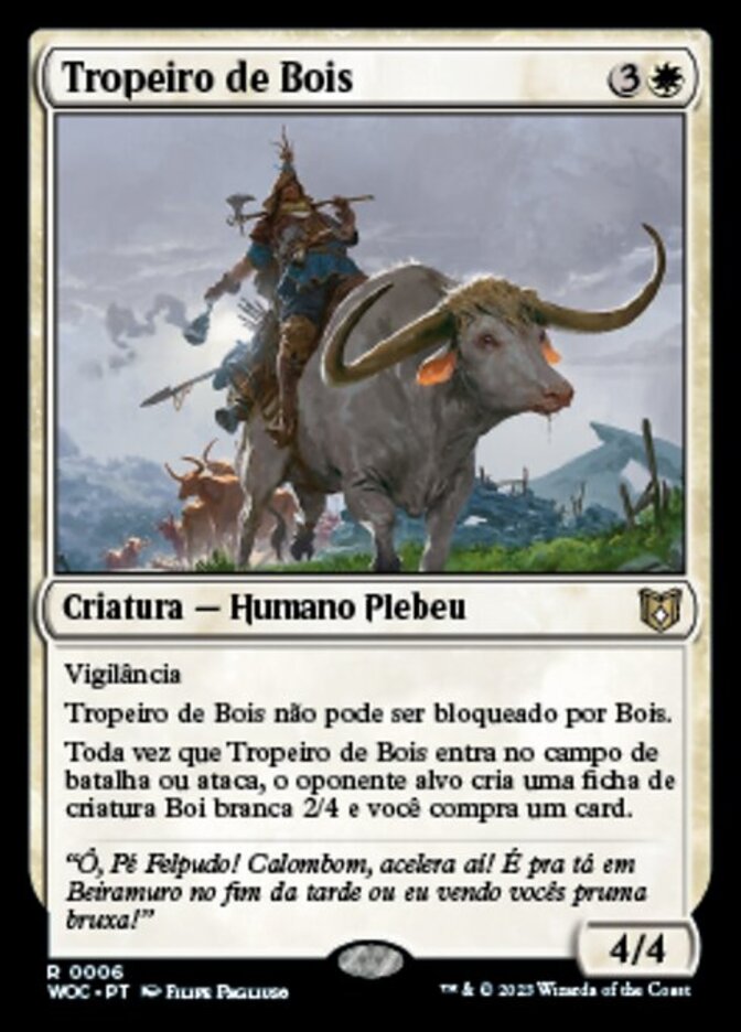 | Rules | Vigilance Ox Drover can't be blocked by Oxen. Whenever Ox Drover enters the battlefield or attacks, target opponent creates a 2/4 white Ox creature token and you draw a card. |
