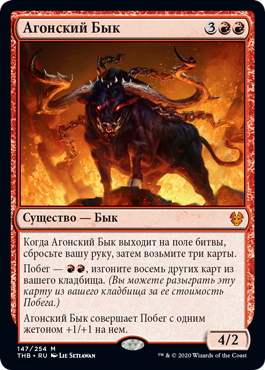 | Rules | When Ox of Agonas enters the battlefield, discard your hand, then draw three cards. Escape—, Exile eight other cards from your graveyard. (You may cast this card from your graveyard for its escape cost.) Ox of Agonas escapes with a +1/+1 counter on it. |