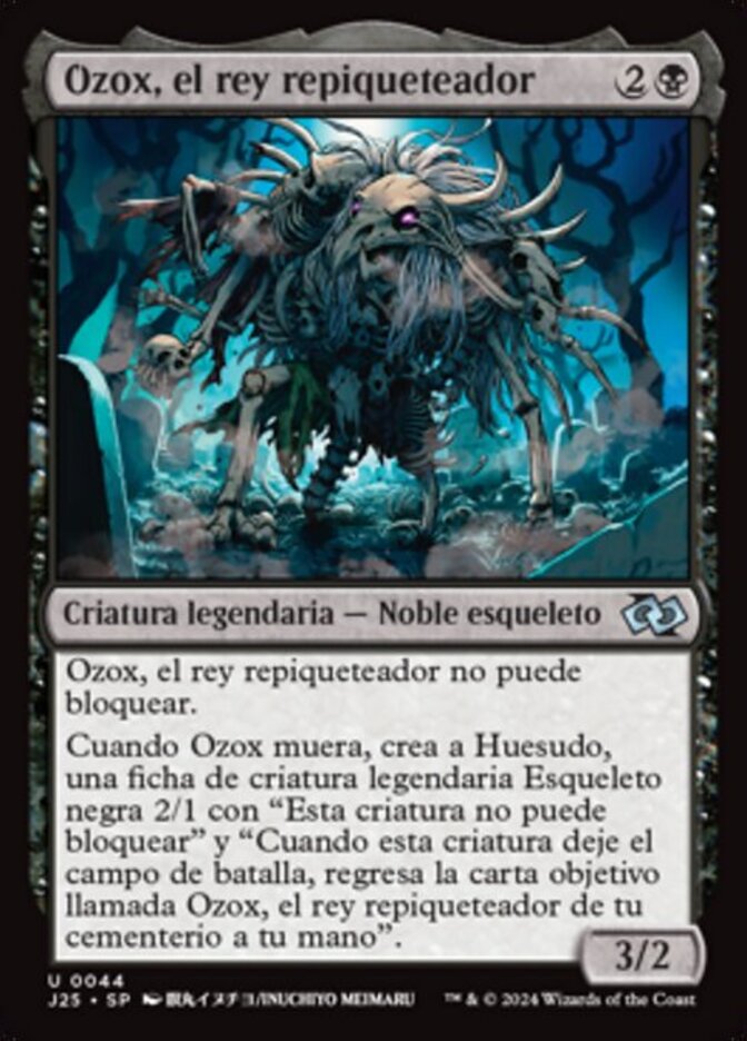 | Rules | Ozox, the Clattering King can't block. When Ozox dies, create Jumblebones, a legendary 2/1 black Skeleton creature token with "This creature can't block" and "When this creature leaves the battlefield, return target card named Ozox, the Clattering King from your graveyard to your hand." |