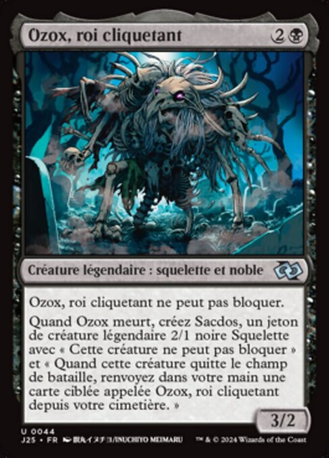 | Rules | Ozox, the Clattering King can't block. When Ozox dies, create Jumblebones, a legendary 2/1 black Skeleton creature token with "This creature can't block" and "When this creature leaves the battlefield, return target card named Ozox, the Clattering King from your graveyard to your hand." |
