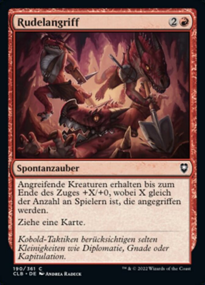 | Rules | Attacking creatures get +X/+0 until end of turn, where X is the number of players being attacked. Draw a card. |