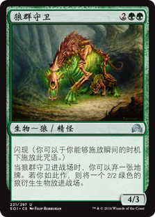 | Rules | Flash (You may cast this spell any time you could cast an instant.) When Pack Guardian enters the battlefield, you may discard a land card. If you do, create a 2/2 green Wolf creature token. |