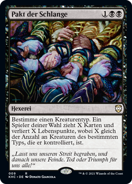 | Rules | Choose a creature type. Target player draws X cards and loses X life, where X is the number of creatures they control of the chosen type. |