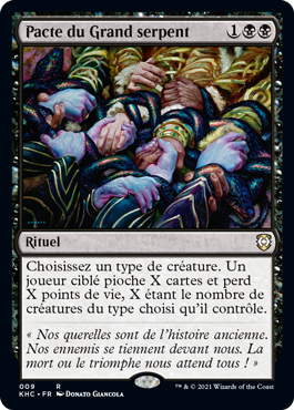 | Rules | Choose a creature type. Target player draws X cards and loses X life, where X is the number of creatures they control of the chosen type. |