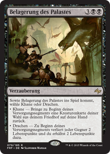 | Rules | As Palace Siege enters the battlefield, choose Khans or Dragons. • Khans — At the beginning of your upkeep, return target creature card from your graveyard to your hand. • Dragons — At the beginning of your upkeep, each opponent loses 2 life and you gain 2 life. |