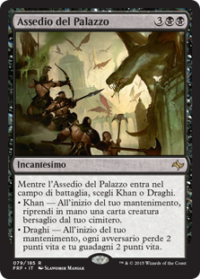 | Rules | As Palace Siege enters the battlefield, choose Khans or Dragons. • Khans — At the beginning of your upkeep, return target creature card from your graveyard to your hand. • Dragons — At the beginning of your upkeep, each opponent loses 2 life and you gain 2 life. |
