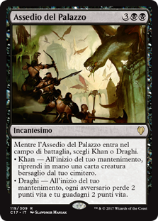 | Rules | As Palace Siege enters the battlefield, choose Khans or Dragons. • Khans — At the beginning of your upkeep, return target creature card from your graveyard to your hand. • Dragons — At the beginning of your upkeep, each opponent loses 2 life and you gain 2 life. |