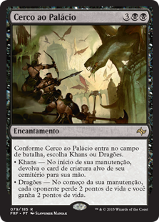 | Rules | As Palace Siege enters the battlefield, choose Khans or Dragons. • Khans — At the beginning of your upkeep, return target creature card from your graveyard to your hand. • Dragons — At the beginning of your upkeep, each opponent loses 2 life and you gain 2 life. |