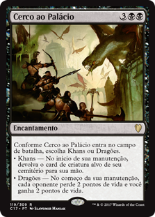 | Rules | As Palace Siege enters the battlefield, choose Khans or Dragons. • Khans — At the beginning of your upkeep, return target creature card from your graveyard to your hand. • Dragons — At the beginning of your upkeep, each opponent loses 2 life and you gain 2 life. |