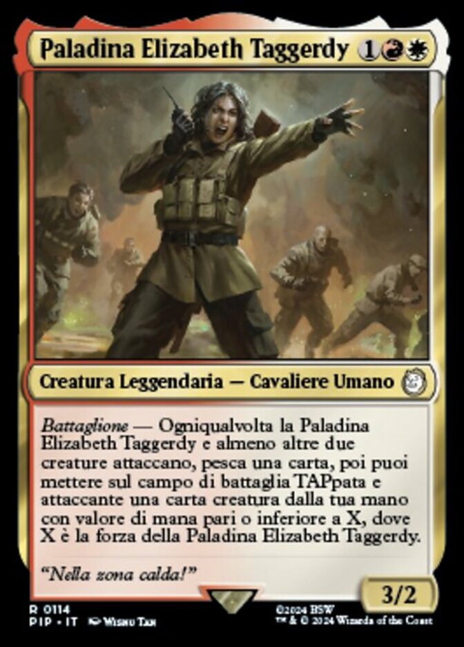 | Rules | Battalion — Whenever Paladin Elizabeth Taggerdy and at least two other creatures attack, draw a card, then you may put a creature card with mana value X or less from your hand onto the battlefield tapped and attacking, where X is Paladin Elizabeth Taggerdy's power. |