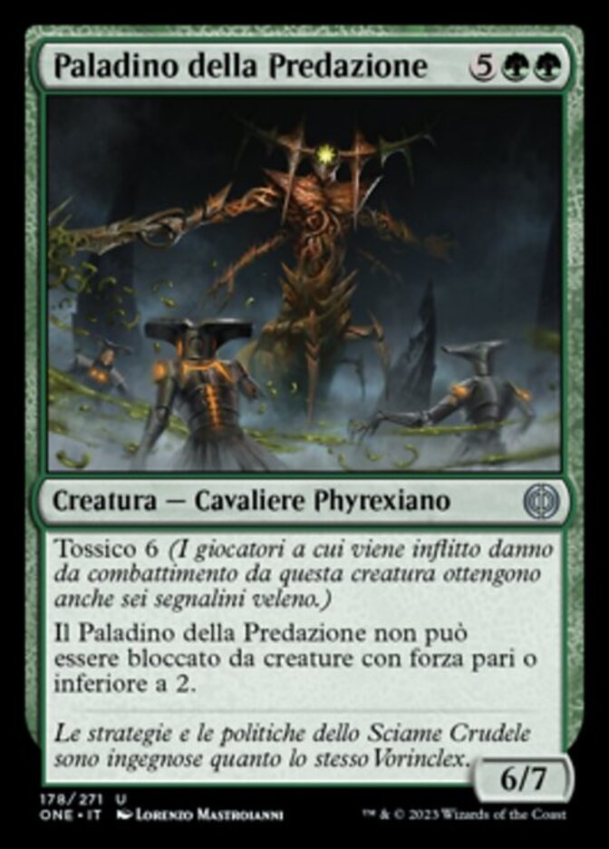 | Rules | Toxic 6 (Plavers dealt combat damage by this creature also get six poison counters.) Paladin of Predation can't be blocked by creatures with power 2 or less. |
