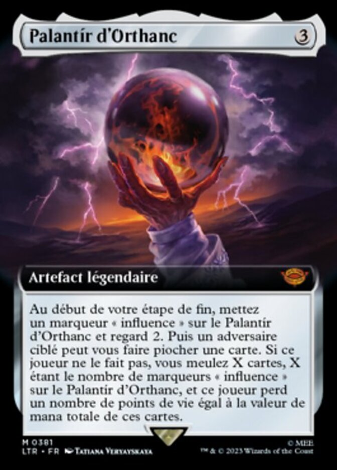 | Rules | At the beginning of your end step, put an influence counter on Palantír of Orthanc and scry 2. Then target opponent may have you draw a card. If that player doesn't, you mill X cards, where X is the number of influence counters on Palantír of Orthanc, and that player loses life equal to the total mana value of those cards. |