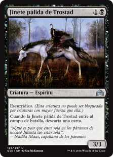 | Rules | Skulk (This creature can't be blocked by creatures with greater power.) When Pale Rider of Trostad enters the battlefield, discard a card. |