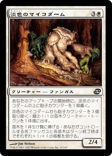 | Rules | At the beginning of your upkeep, put a spore counter on Pallid Mycoderm. Remove three spore counters from Pallid Mycoderm: Create a 1/1 green Saproling creature token. Sacrifice a Saproling: Each creature you control that's a Fungus or a Saproling gets +1/+1 until end of turn. |