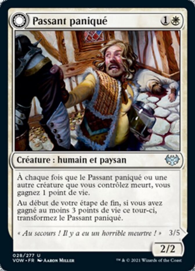 | Rules | Whenever Panicked Bystander or another creature you control dies, you gain 1 life. At the beginning of your end step, if you gained 3 or more life this turn, transform Panicked Bystander. // Whenever Cackling Culprit or another creature you control dies, you gain 1 life. : Cackling Culprit gains deathtouch until end of turn. |