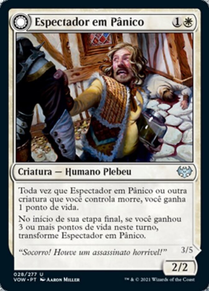 | Rules | Whenever Panicked Bystander or another creature you control dies, you gain 1 life. At the beginning of your end step, if you gained 3 or more life this turn, transform Panicked Bystander. // Whenever Cackling Culprit or another creature you control dies, you gain 1 life. : Cackling Culprit gains deathtouch until end of turn. |