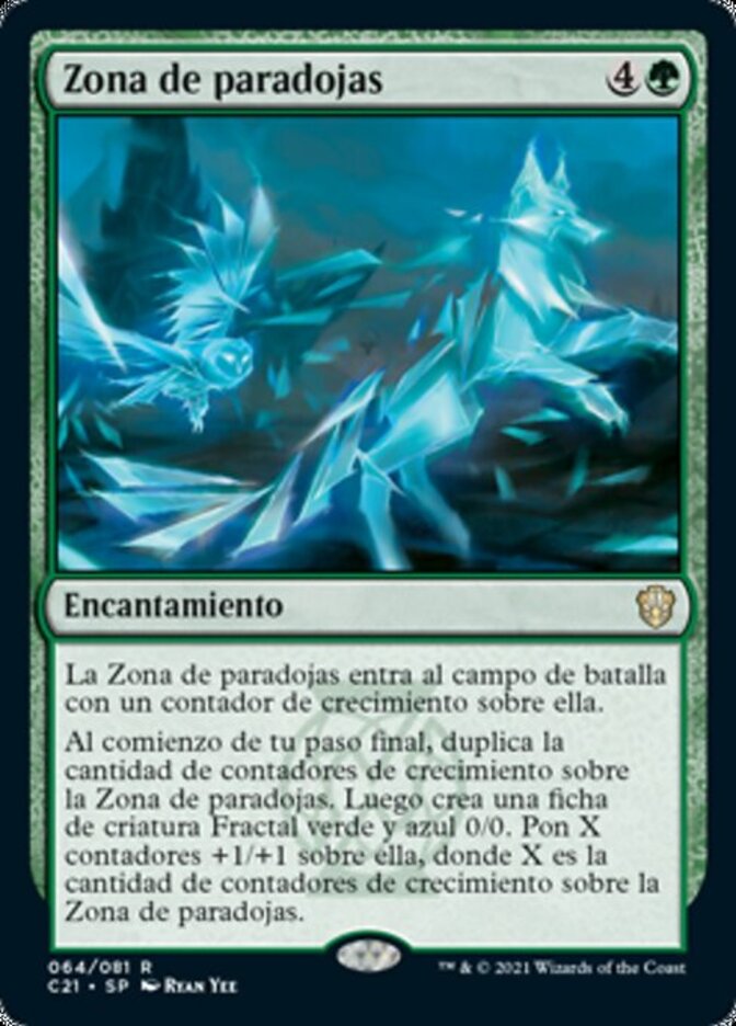 | Rules | Paradox Zone enters the battlefield with a growth counter on it. At the beginning of your end step, double the number of growth counters on Paradox Zone. Then create a 0/0 green and blue Fractal creature token. Put X +1/+1 counters on it, where X is the number of growth counters on Paradox Zone. |