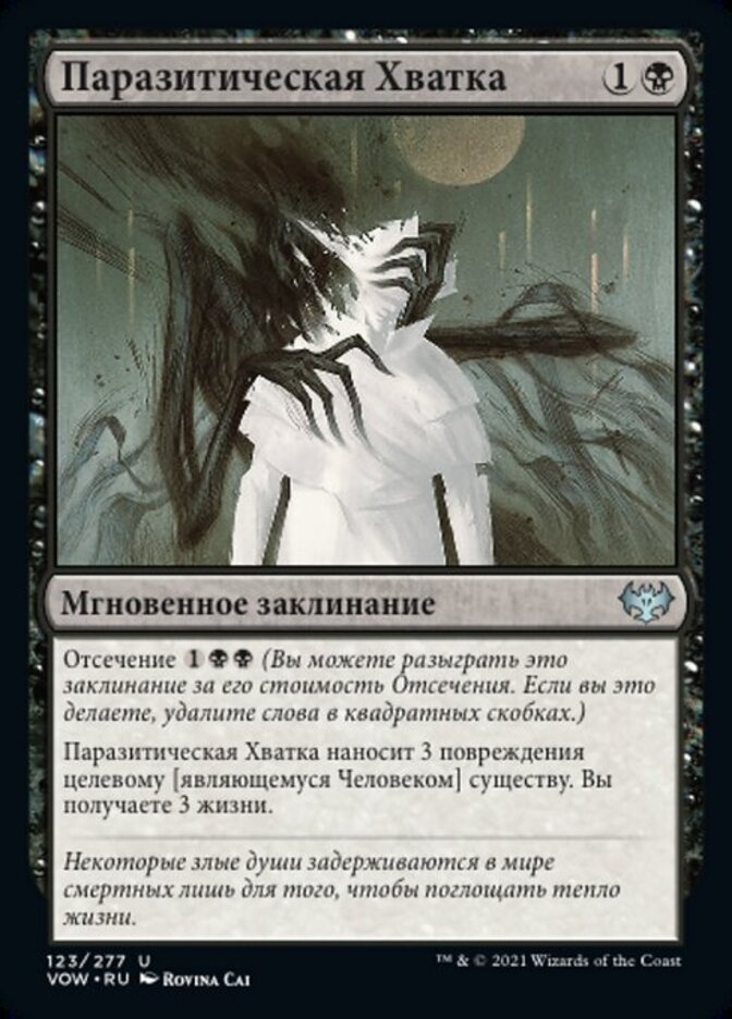 | Rules | Cleave (You may cast this spell for its cleave cost. If you do, remove the words in square brackets.) Parasitic Grasp deals 3 damage to target [Human] creature. You gain 3 life. |