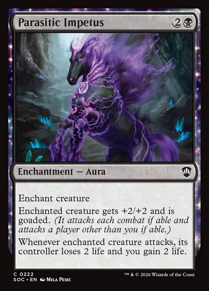 | Rules | Enchant creature Enchanted creature gets +2/+2 and is goaded. (It attacks each combat if able and attacks a player other than you if able.) Whenever enchanted creature attacks, its controller loses 2 life and you gain 2 life. |