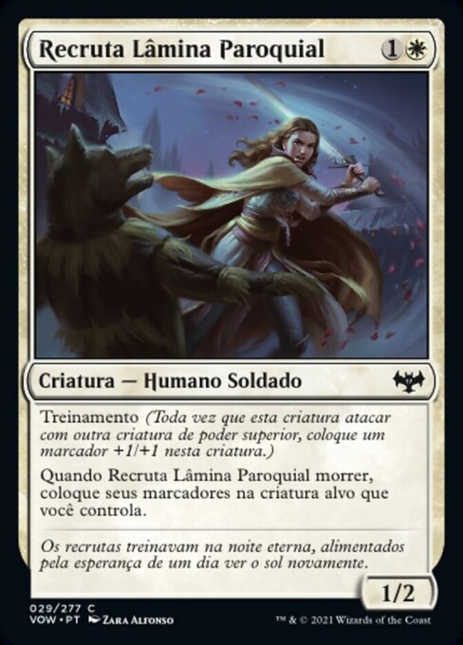 | Rules | Training (Whenever this creature attacks with another creature with greater power, put a +1/+1 counter on this creature.) When Parish-Blade Trainee dies, put its counters on target creature you control. |
