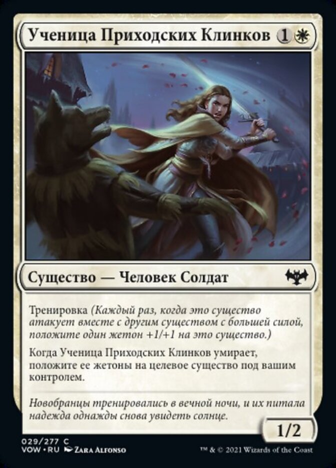 | Rules | Training (Whenever this creature attacks with another creature with greater power, put a +1/+1 counter on this creature.) When Parish-Blade Trainee dies, put its counters on target creature you control. |