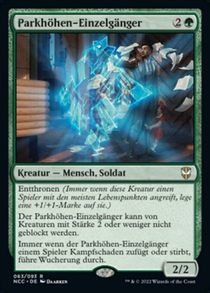 | Rules | Dethrone (Whenever this creature attacks the player with the most life or tied for most life, put a +1/+1 counter on it.) Park Heights Maverick can't be blocked by creatures with power 2 or less. Whenever Park Heights Maverick deals combat damage to a player or dies, proliferate. |
