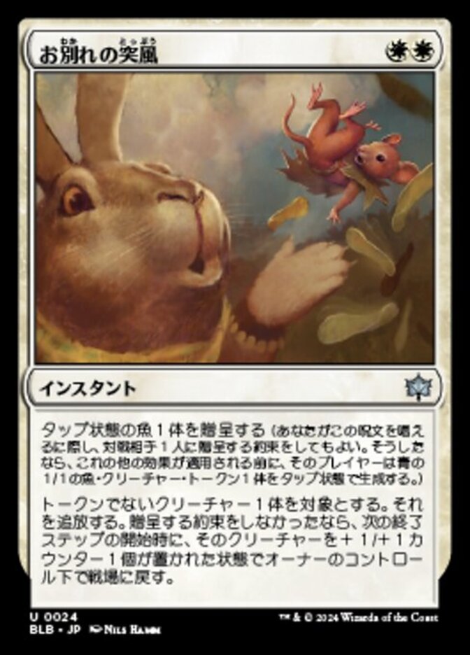 | Rules | Gift a tapped Fish (You may promise an opponent a gift as you cast this spell. If you do, they create a tapped 1/1 blue Fish creature token before its other effects.) Exile target nontoken creature. If the gift wasn't promised, return that creature to the battlefield under its owner's control with a +1/+1 counter on it at the beginning of the next end step. |