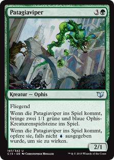 | Rules | Flying When Patagia Viper enters the battlefield, create two 1/1 green and blue Snake creature tokens. When Patagia Viper enters the battlefield, sacrifice it unless was spent to cast it. |