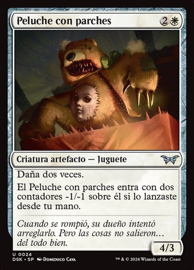Patched Plaything enters with two -1/-1 counters on it if you cast it from your hand.
