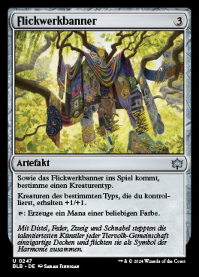 | Rules | As Patchwork Banner enters, choose a creature type. Creatures you control of the chosen type get +1/+1. : Add one mana of any color. |