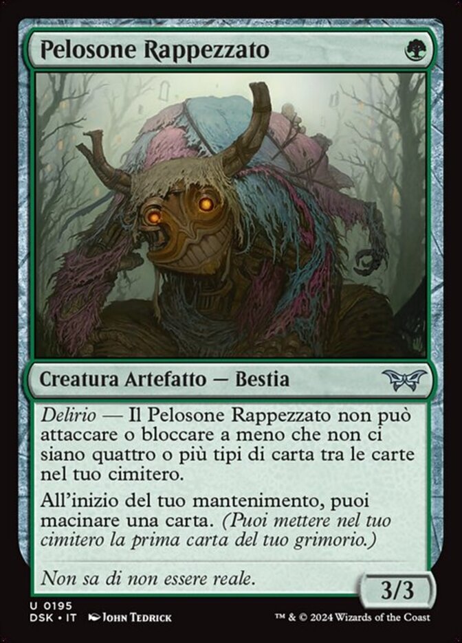 | Rules | Delirium — Patchwork Beastie can't attack or block unless there are four or more card types among cards in your graveyard. At the beginning of your upkeep, you may mill a card. (You may put the top card of your library into your graveyard.) |