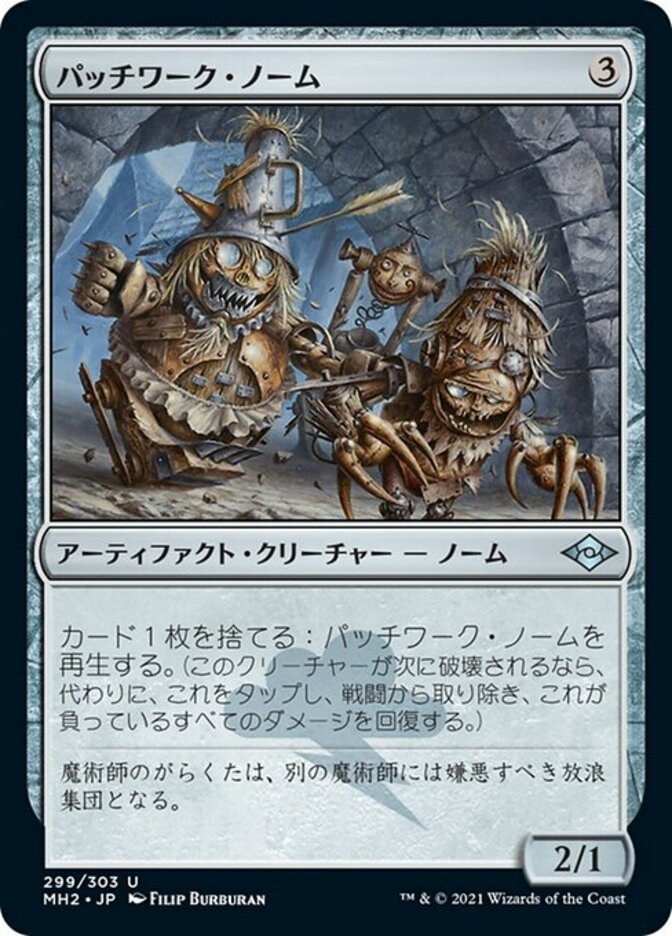 | Rules | Discard a card: Regenerate Patchwork Gnomes. (The next time this creature would be destroyed, instead tap it, remove it from combat, and heal all damage on it.) |