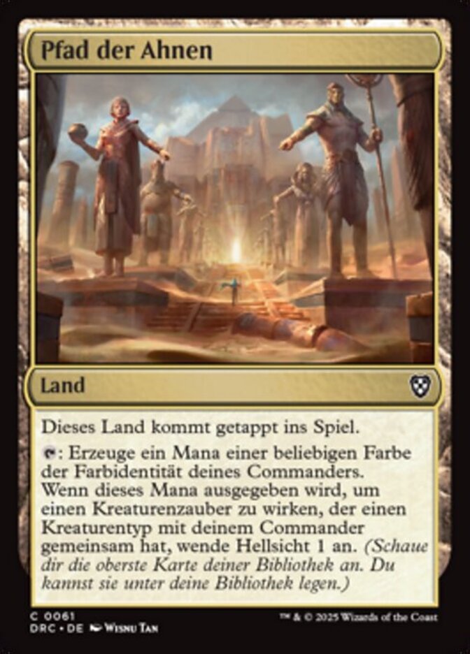| Rules | Path of Ancestry enters the battlefield tapped. : Add one mana of any color in your commander's color identity. When that mana is spent to cast a creature spell that shares a creature type with your commander, scry 1. (Look at the top card of your library. You may put that card on the bottom of your library.) |