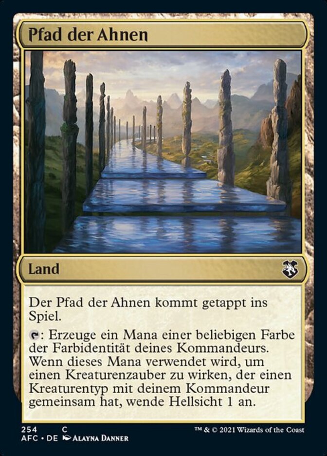 | Rules | Path of Ancestry enters the battlefield tapped. : Add one mana of any color in your commander's color identity. When that mana is spent to cast a creature spell that shares a creature type with your commander, scry 1. (Look at the top card of your library. You may put that card on the bottom of your library.) |