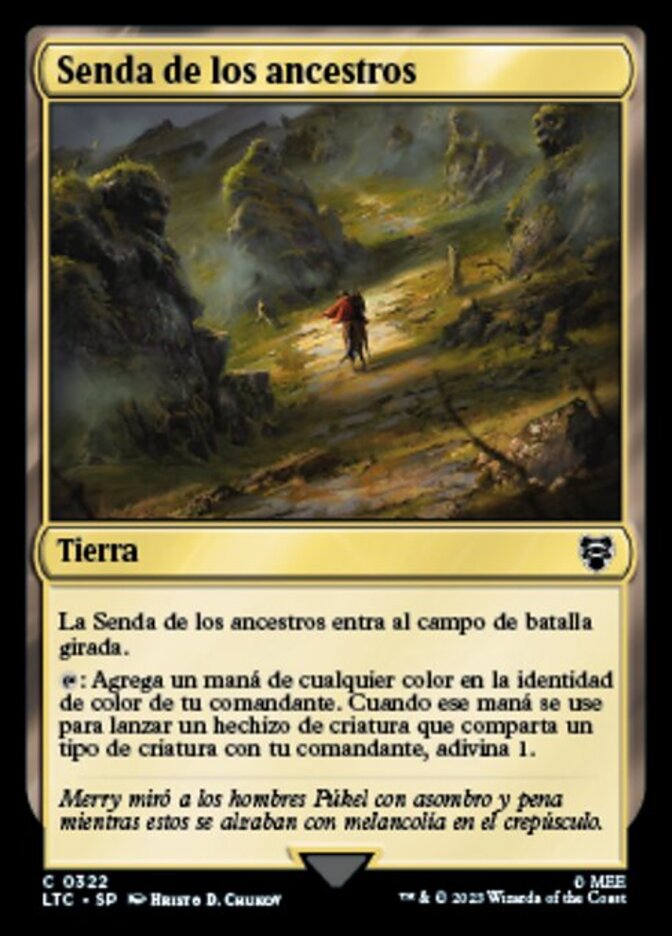 | Rules | Path of Ancestry enters the battlefield tapped. : Add one mana of any color in your commander's color identity. When that mana is spent to cast a creature spell that shares a creature type with your commander, scry 1. (Look at the top card of your library. You may put that card on the bottom of your library.) |