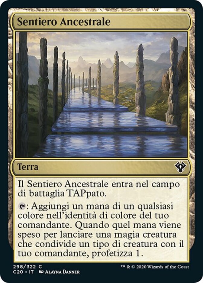 | Rules | Path of Ancestry enters the battlefield tapped. : Add one mana of any color in your commander's color identity. When that mana is spent to cast a creature spell that shares a creature type with your commander, scry 1. (Look at the top card of your library. You may put that card on the bottom of your library.) |