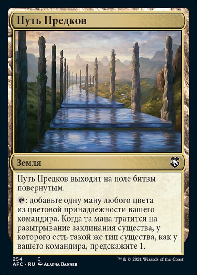 | Rules | Path of Ancestry enters the battlefield tapped. : Add one mana of any color in your commander's color identity. When that mana is spent to cast a creature spell that shares a creature type with your commander, scry 1. (Look at the top card of your library. You may put that card on the bottom of your library.) |