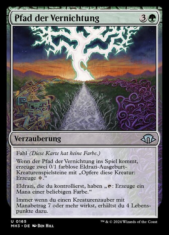| Rules | Devoid (This card has no color.) When Path of Annihilation enters the battlefield, create two 0/1 colorless Eldrazi Spawn creature tokens with "Sacrifice this creature: Add ." Eldrazi you control have ": Add one mana of any color." Whenever you cast a creature spell with mana value 7 or greater, you gain 4 life. |