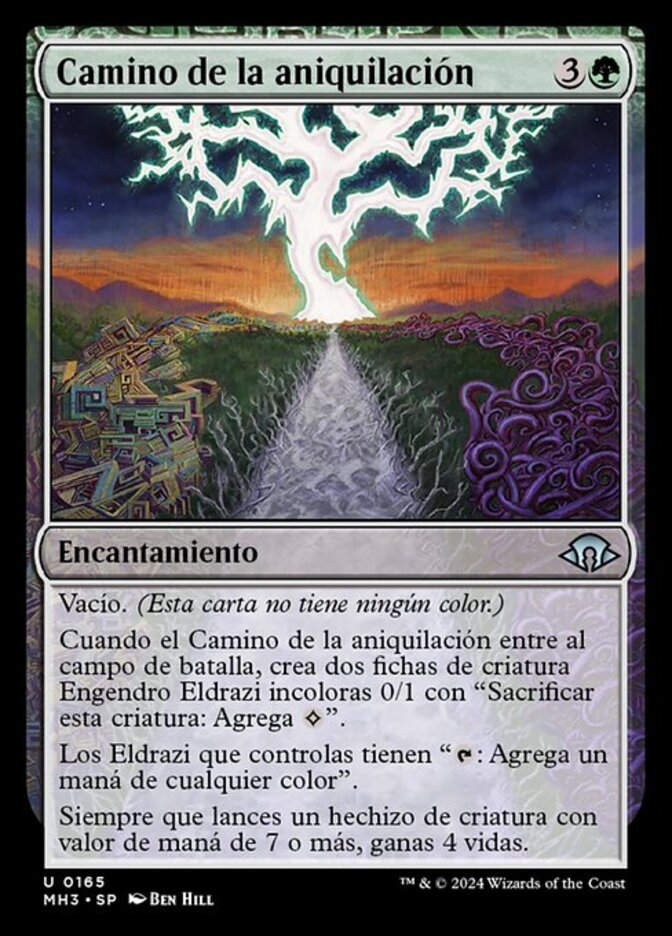 | Rules | Devoid (This card has no color.) When Path of Annihilation enters the battlefield, create two 0/1 colorless Eldrazi Spawn creature tokens with "Sacrifice this creature: Add ." Eldrazi you control have ": Add one mana of any color." Whenever you cast a creature spell with mana value 7 or greater, you gain 4 life. |
