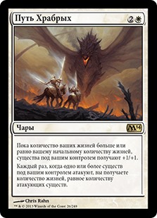 | Rules | As long as your life total is greater than or equal to your starting life total, creatures you control get +1/+1. Whenever one or more creatures you control attack, you gain life equal to the number of attacking creatures. |