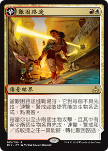 | Rules | When Path of Mettle enters the battlefield, it deals 1 damage to each creature that doesn't have first strike, double strike, vigilance, or haste. Whenever you attack with at least two creatures that have first strike, double strike, vigilance, and/or haste, transform Path of Mettle. // (Transforms from Path of Mettle.) : Add one mana of any color. , : Metzali, Tower of Triumph deals 2 damage to each opponent. , : Choose a creature at random that attacked this turn. Destroy that creature. |